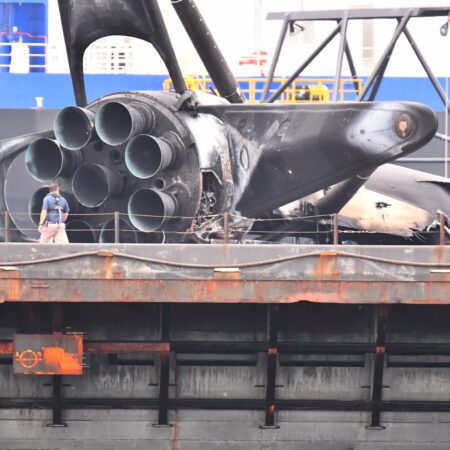 وصلت مُعزّزَةُ فالكون 9 التابعة لشركة سبيس إكس، المُتضرّرة بشدة، إلى ميناء كينيدي الفضائي بعد حريقٍ عقب الهبوط – يو إس